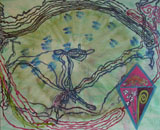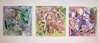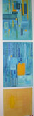 My work began with using mapping as a conceptual framework. My paintings have a horizontal orientation. Simultaneously, the concept of time was explored and my link to people of the past was constructed. "Art is memory" (Louise Bourgeois). "Le cheminement..." (left) is a map of the journeys of some of my great-great-great-great-great-great-great-great-grandmothers, my parents and myself.In my ancestral line, there are 45 filles du roi (King’s daughters). They came to New France (Quebec) between 1663 and 1674. It was unusual for women to travel at that time. I am amazed by their courage. The navy blue lines, moving from right to left, is my way of remembering these ancestors.I chose red lines to represent my father. They represent his treks, as a soldier in WW II. His war records prominently display the acronym, NRMA. I have discovered that it stands for the National Resource Mobility Act. This act conscripted men, legislating that they would not be sent abroad. The act was ignored and men, such as my father, were sent to fight overseas. Having been sent to Victoria, B.C. and Siska, Alaska, my father was then transferred to England. From there, he was sent to continental Europe. My father received the medal of France. My mother is represented by a green line. She was adopted from an institution in Montreal by a family in Smooth Rock Falls, Ontario. As far as my family has been able to determine, she was born of an Irish, Catholic, English-speaking woman from the Gaspé-Iles de la Madeleine area. I represented myself with royal blue and burgundy lines, combining the colours used to symbolize my father and great-great-great-great-great-great-great-great-grandmothers. I have lived in three of Canada’s provinces and I have travelled in Europe, Australia and parts of Asia. The deer tracks represent my experience at home. I live in the country and deer roam the land. Some associate deer with souls and I like to think that my late husband might be visiting through them. I have developed a personal coat of arms for this map. It is in the shape of a lozenge. This is the conventional depiction of a "shield" for a woman. It was assumed "that women did not make war or participate in tournaments and, therefore, had no practical use for a shield." I decided to include a red fox, white florets and a spiraled fern as icons on my coat of arms. The red fox represents beauty, intelligence and refers to St. Exupéry`s Le Petit Prince. Wildflowers have always attracted me. I chose white florets in reference to the flowers making up the pattern throughout the tapestries, La Dame à la Licorne. The spiral fern alludes to the infinity of time, our minuteness within it, to knowledge through travel, to growth and development. Arlene Laskey "Waking the Goddess 1 - 4" and "Meditations in Blue and Yellow 1 - 3"